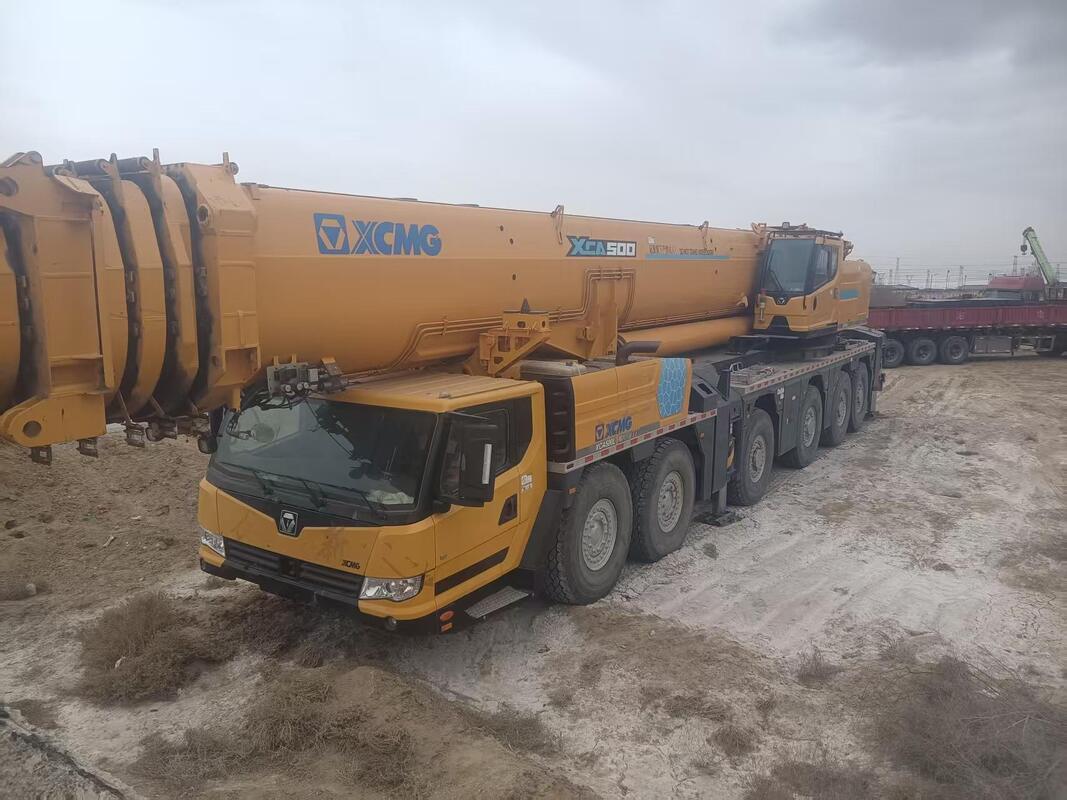 Specifications: 500-ton capacity with 85m 7-section boom & 50m jib. Full superlift system, 153t counterweight, Weichai Stage VI engine. Includes 4x heavy-duty pad feet (2.3x3m) for superior ground stability.